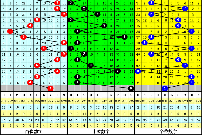 百位号码:第26090期-26094期奖号为:8-5-8-5-4,振幅为4点,奖号比较集中,本期预计百位走高,关注号码7。