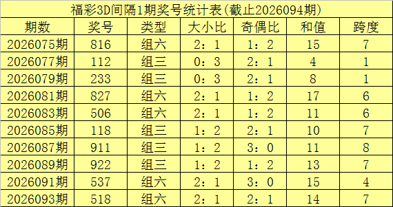 开奖回顾:福利彩票3D第26094期奖号开出418。奖号类型为组六,奇偶形态为偶奇偶,大小形态为小小大。
